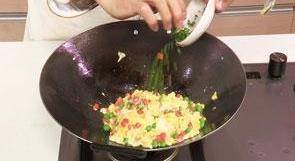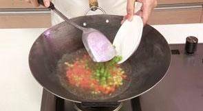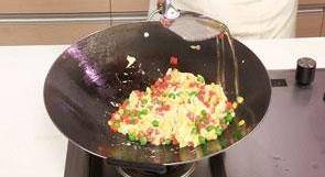 11 再放入胡蘿卜、玉米、青豆炒熟。