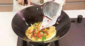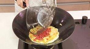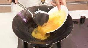 9 鍋底留油,倒入蛋液拌勻。