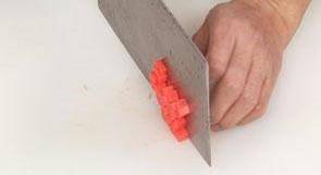 2 去皮洗凈的胡蘿卜切粒。