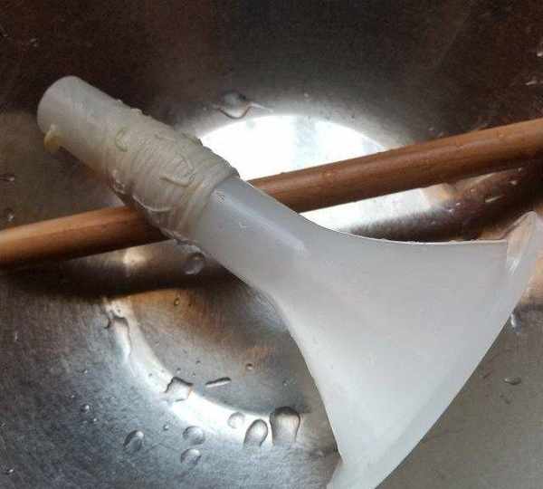 第8步、把腸衣全套在灌腸神器上,腸衣尾端打個結。