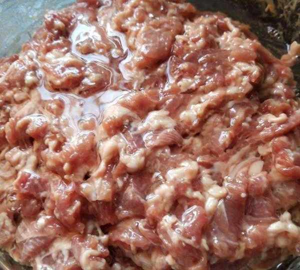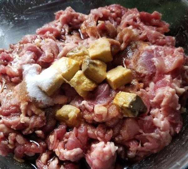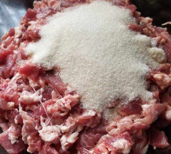 第3步、把瘦肉和肥肉混合,放糖翻拌至糖溶化。