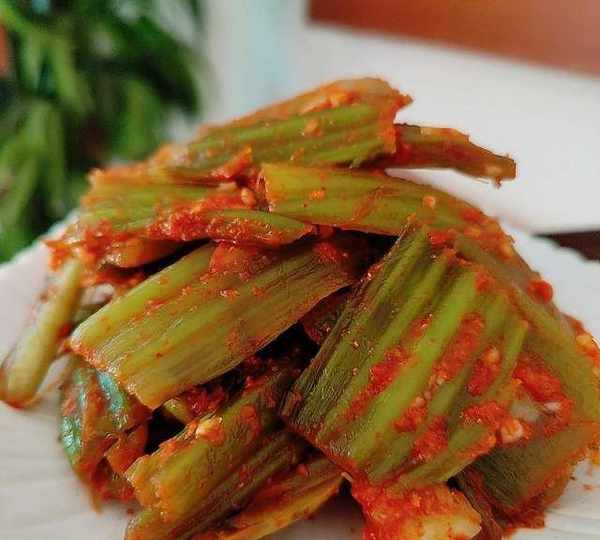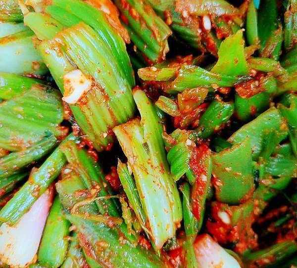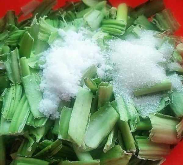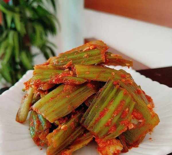 原料:芥菜菜梗、大蒜梗、大蒜頭、辣椒面、白酒、鹽、糖。