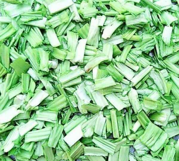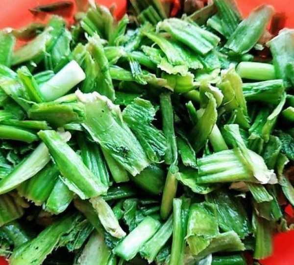 第7步、芥菜梗和大蒜梗都切成小段。