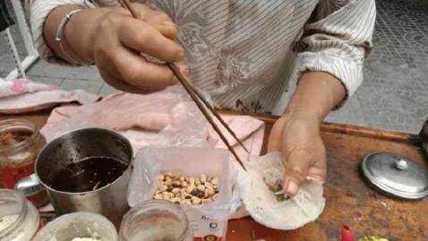 這個美食叫舂,做好以後和春卷有點相似,但畢竟隻是街邊小吃,肯定不如春卷高大上啊!小編可以給你描述一下這個美食的外形,它是由薄薄的面皮中卷入花生碎,蘿卜絲,蘿卜幹,辣椒還有芥末而成的!