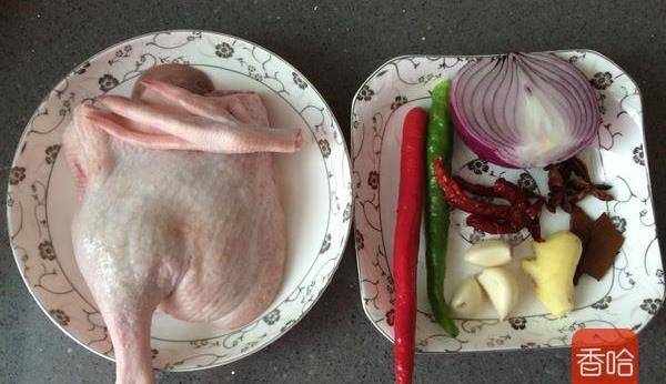 鴨半隻、洋蔥半個、青椒一個、紅椒一個、薑片6片、蒜瓣4瓣、八角適量、桂皮適量、幹辣椒6個、生抽適量、料酒適量、鹽適量、啤酒一瓶