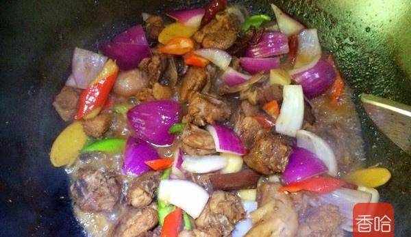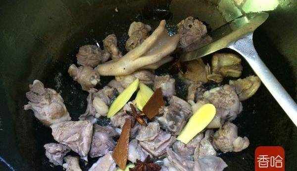 7.鴨塊煸炒至滲出油份時,加入薑,蒜,八角,桂皮繼續炒兩分鐘左右。