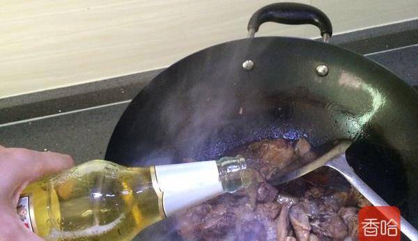 9.炒出香味後,倒入啤酒和幹辣椒一起煮,蓋上鍋蓋