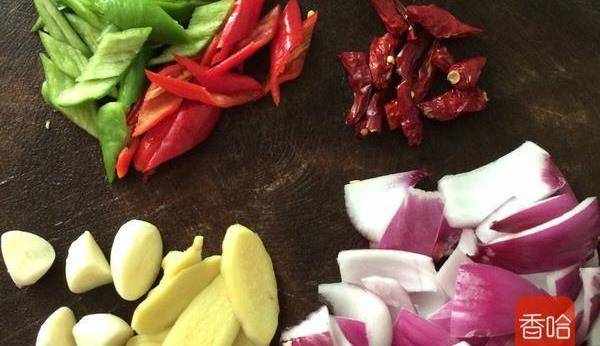 3.辣椒,薑,蒜,洋蔥切塊備用。