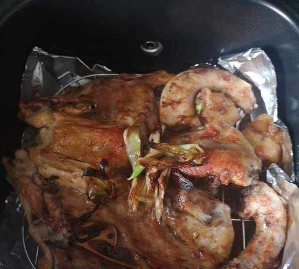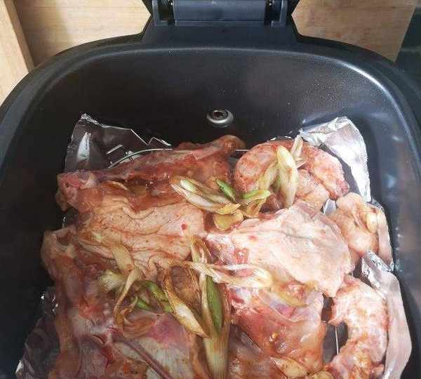 第5步、把醃制好的雞架等放在空氣炸鍋的架子上,內裡向下放好。
