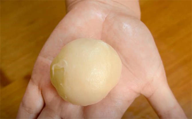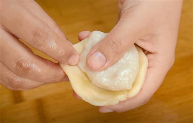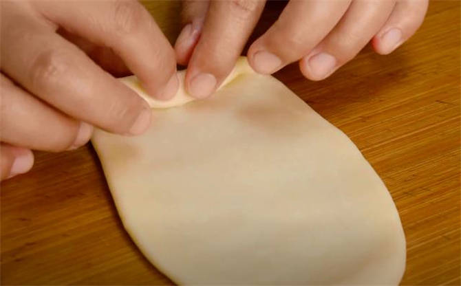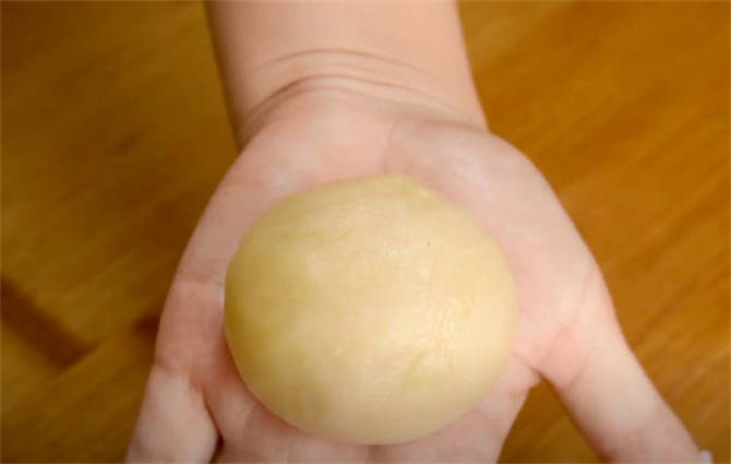 9.都做好之後我們取出做好的劑子,搟成餅皮,中間包入糯米團,收口處捏緊。