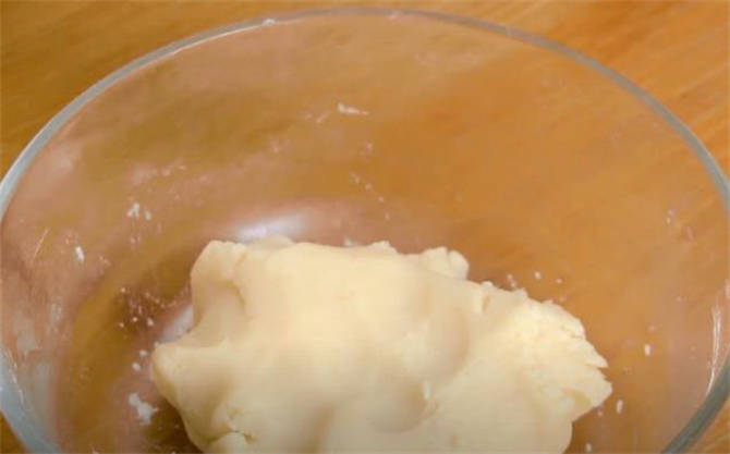 2.做這個餅少不瞭油酥,這個也是起層的關鍵,在150g面粉裡倒入75g玉米油,團成一個油酥面團備用。