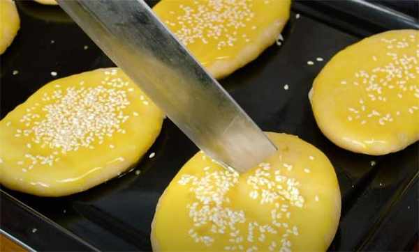 11.胚子做好之後按扁,搟成牛舌狀,然後放入烤盤裡,刷一層食用油,撒白芝麻增香,表面劃幾刀有助於出層。