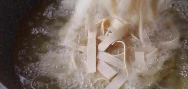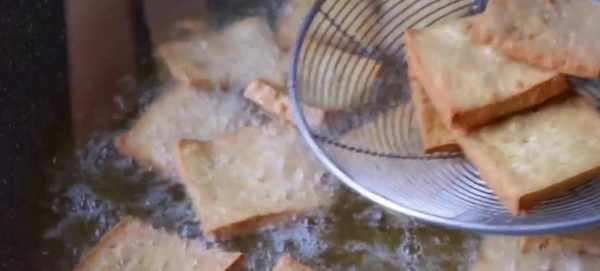 首先準備一塊老一點的豆腐,再切成厚度約5毫米的豆腐片,不要切太薄,太薄的話容易爛掉。再準備一些豆腐皮,切成寬度約兩厘米的長條,切好之後放到盆裡備用。鍋開大火,多加一些食用油,筷子周圍氣泡比較密集的話就可以下入豆腐皮,炸的時候開大火。