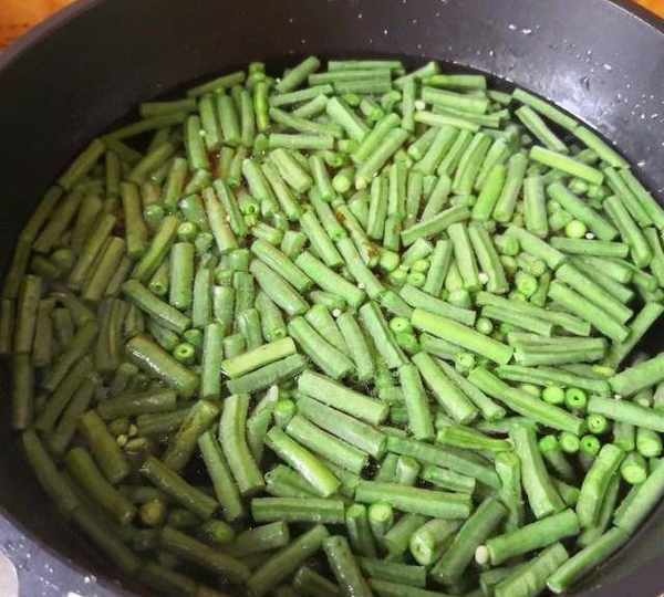 第1步、豇豆去掉兩頭,再清洗幹凈,切成1寸左右的段,然後煮鍋裡放適量清水,加一勺鹽,等水快開的時候把豇豆段放到鍋裡焯水,加鹽可以讓豇豆的顏色變得翠綠更好看。