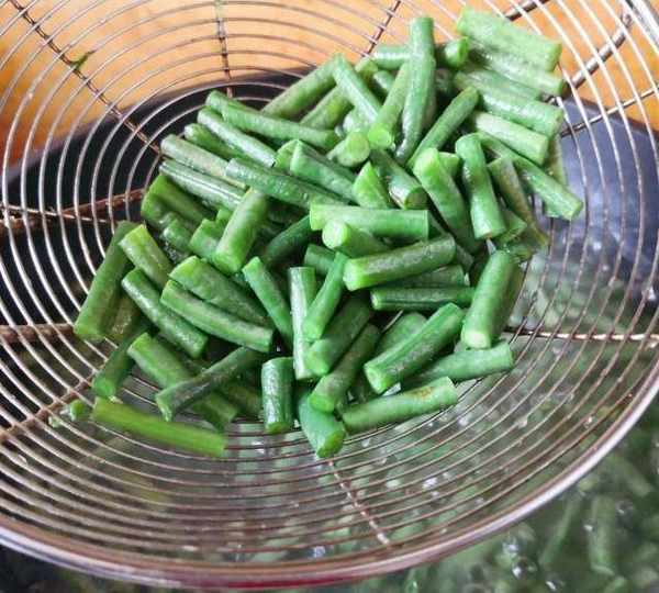 第2步、等豇豆斷生瞭就可以撈出來,投入到涼水裡完全冰涼,這樣可以保持豇豆脆脆的口感。