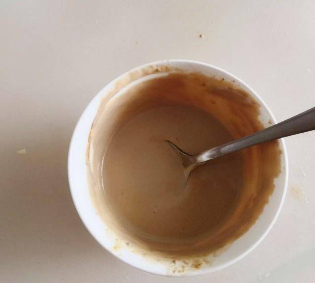 第3步、接下來就是調制醬汁瞭,先來調芝麻醬,芝麻醬加入純凈水或是涼白開水,不要一次加很多,要慢慢加,然後攪拌,先是芝麻醬會變稠,接下來再加水會變稀,直到提起勺子倒下來的芝麻醬成順滑的液體,但會掛住勺子就可以瞭,太稠瞭吃起來會膩,太稀瞭掛不住豇豆,不好吃。
