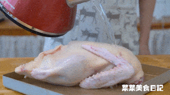 8.炒好的八寶餡起鍋,釀好的八寶鴨擦乾用開水流燙一下鴨皮備用,可讓鴨皮上色均勻,口感彈牙。