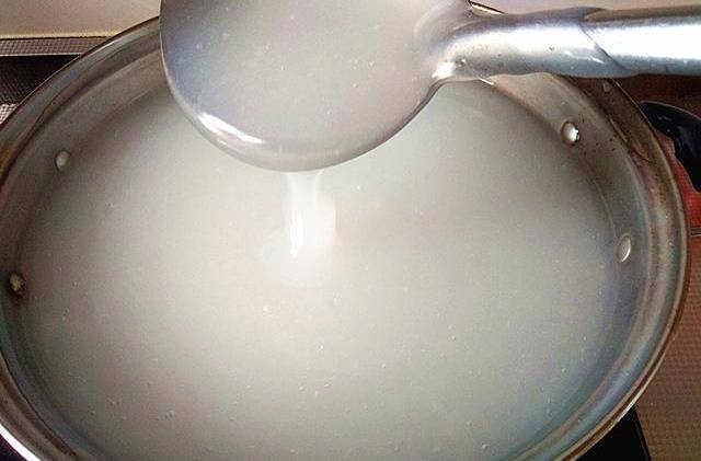 4.當看到鍋底出現密集小氣泡時,將稀釋的豌豆淀粉水溶液,逐次放入鍋中,並不斷攪拌。