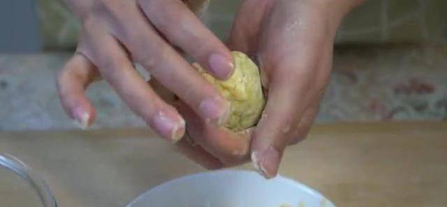 西葫蘆出瞭好多水,我們攥幹水分,水不要倒,一會還有妙用。雞蛋碎,放一把蝦皮,既能補鈣又能提鮮,當然如果您不喜歡也可以不放,加一勺蠔油,少量胡椒粉,再來點香油,攪拌均勻。用手抓一把餡料,搓成大小均勻的菜丸子放到玉米面中滾滾,然後再捏一捏菜丸子的水分會讓面團更濕潤,這樣可以沾更多的玉米面。