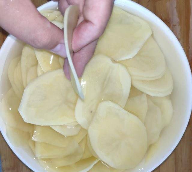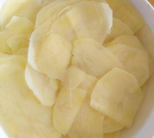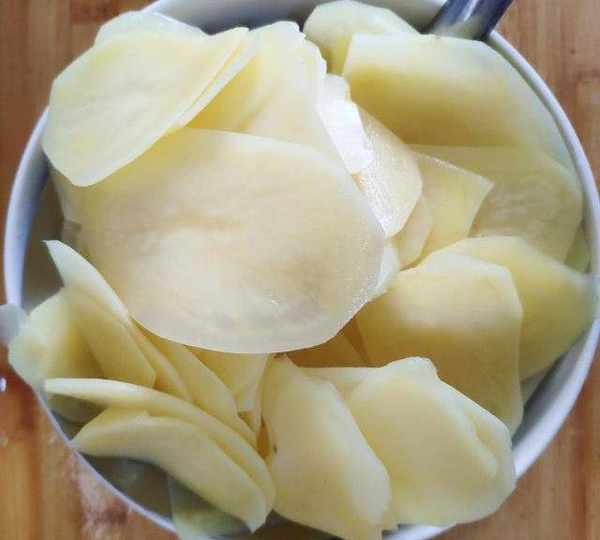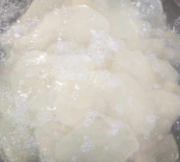 第5步、水開放入泡好的土豆片,再次開鍋煮40秒,土豆變色,撈出。(時間長短取決土豆片的厚度,切的薄就少煮一會兒)。