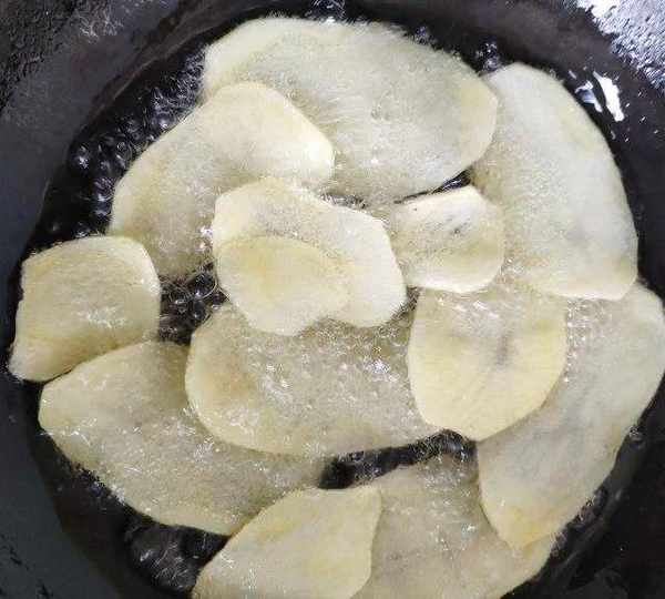 第10步、炸到土豆片變硬,土豆的筋有點焦黃,就炸好瞭。