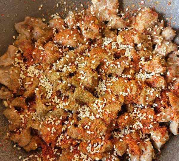 第6步、孜然粉,辣椒粉,白芝麻備用。
