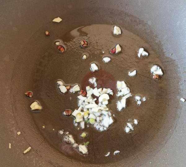 第11步、鍋一點點底油,蒜蓉,幾粒花椒,炒香。