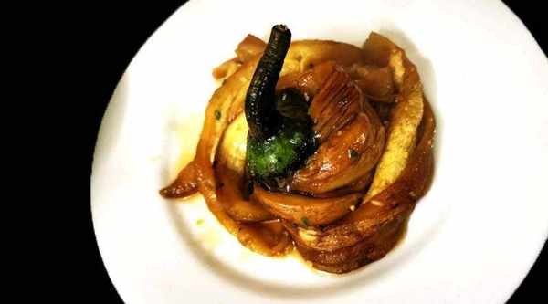 擺盤時盤底放入一點汁,再放入茄子,把汁澆在茄子上即可