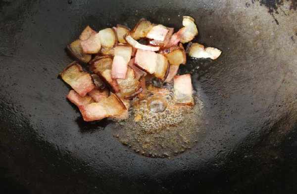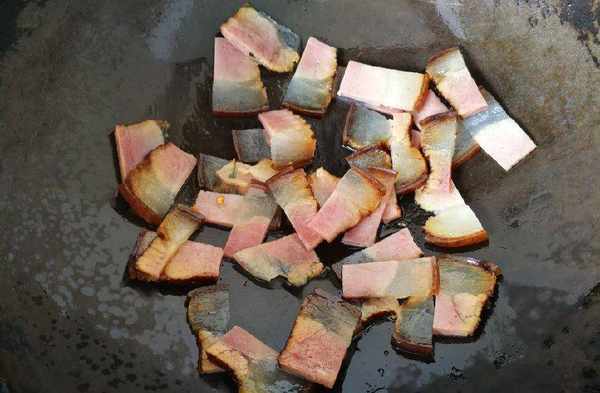 3、鍋中放少許油潤鍋,放入臘肉小火煸炒。