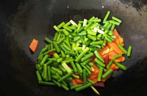 5、先放胡蘿卜煸炒,胡蘿卜變軟後放入蒜臺,中火翻炒。