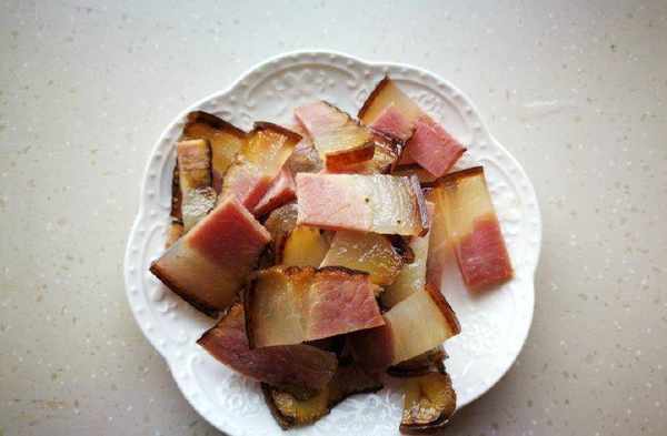 4、炒出油脂後將臘肉盛出來備用,將油留在鍋裡。