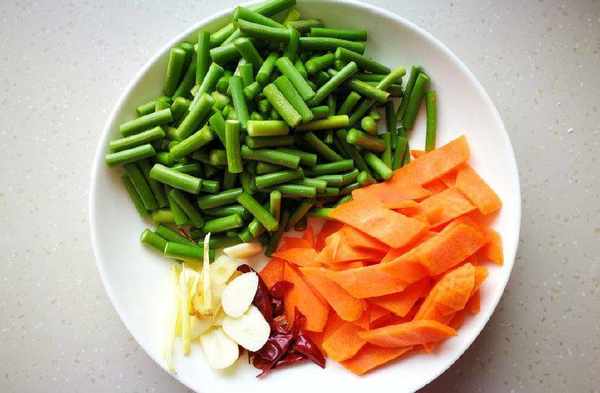 1、蒜臺切段,胡蘿卜切片,生薑切絲,大蒜切片,幹紅辣椒掰開後去籽。