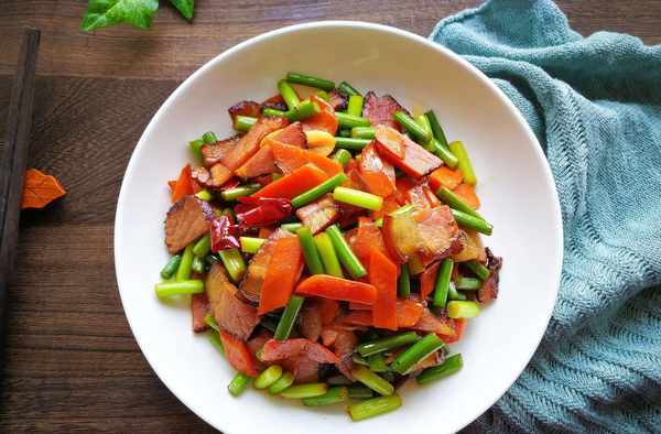 準備食材:臘肉一塊,胡蘿卜一根,蒜臺一小把,幹紅辣椒兩根,生薑兩片,生抽一小勺