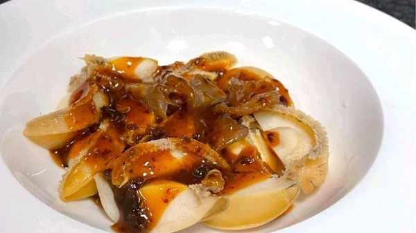 海蜇頭沖淡改刀成片,鮑魚仔對切,加入椒麻醬拌勻即可
