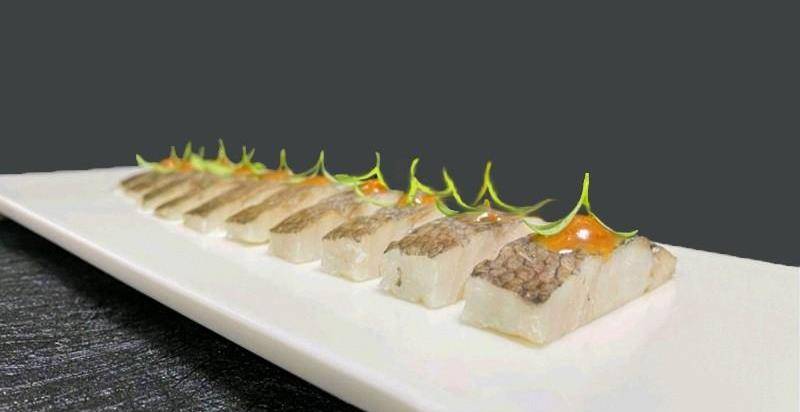 將醃制好的大黃魚放入真空袋中,加入黃酒真空,再用65度低溫45分鐘至熟,取出放入冰水中