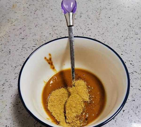 第4步、取一個小碗,三勺芝麻醬,2勺南德調味料,拌勻備用,(南德調味料裡面有鹽,不要加瞭)。