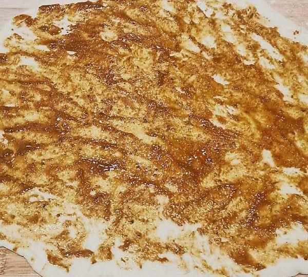 第8步、把調好的芝麻醬均勻的抹在面片上。