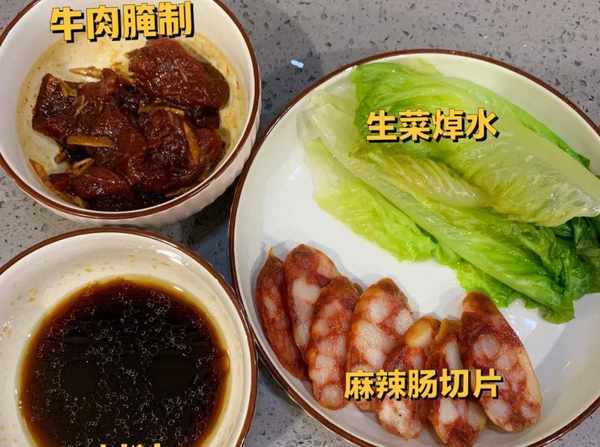 1、大米用水浸泡30分鐘,麻辣腸切片,牛肉切片加薑絲、少許生抽、蠔油、花生油醃制,生菜焯水。