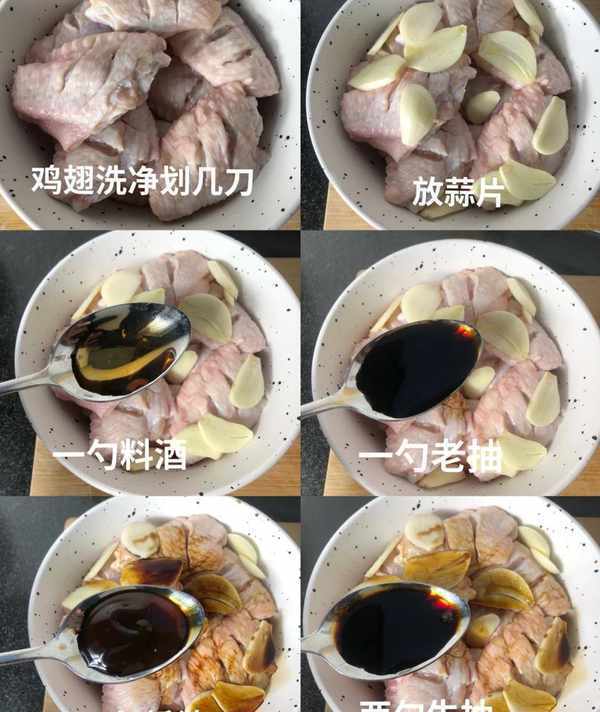 1、醃制雞翅 雞翅兩面花刀、蒜片、一勺料酒、一勺老抽、一勺蠔油、兩勺生抽、2勺蜂蜜、少許鹽和雞精,抓勻醃制兩個小時入味。