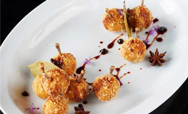 鴨腿處理幹凈,洗凈血水,剔骨去皮取肉,肉剁細加入蔥、薑、料酒、鹽的、淀粉和適量的蛋清,放入料理機攪打成泥,分成小球狀,裹上面粉、蛋液、面包糠,插入小根骨頭,入油鍋炸熟炸酥撈出控油