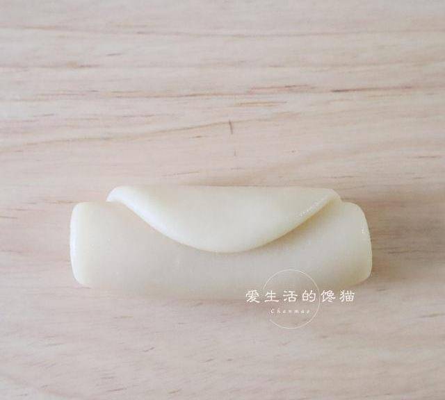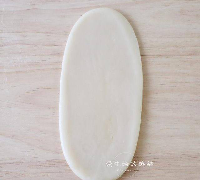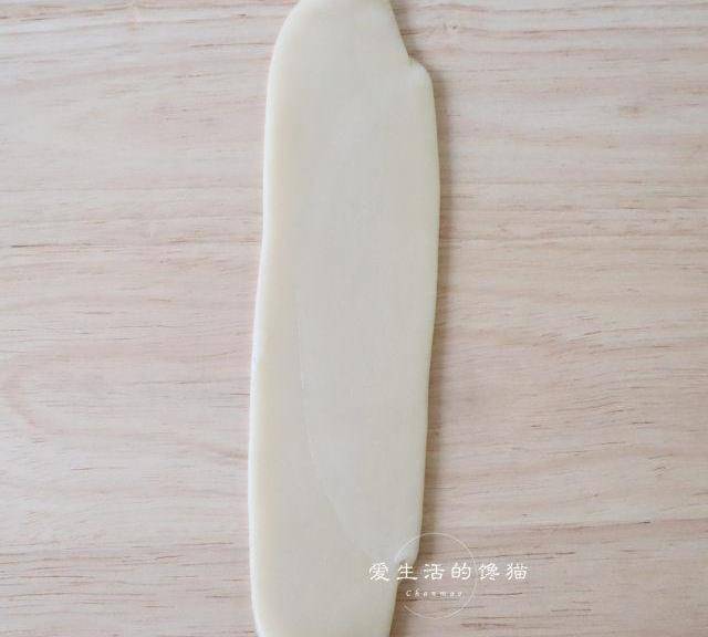 第9步、取一個面團,收口朝上,搟成對12CM的長舌狀。