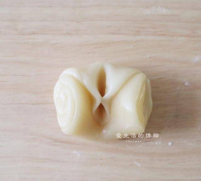 第14步、把剛分好大的餡包入裡面,捏緊收口後朝下壓扁成餅狀。