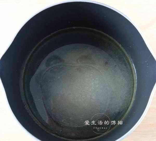 第1步、將餡裡面的花生油,清水和糖放進鍋裡煮沸,攪拌融化。