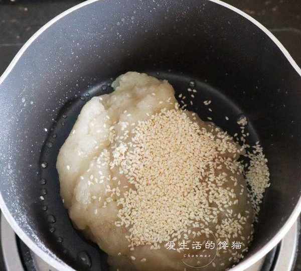 第2步、熄火後把熟的糯米粉倒入鍋裡,快速拌勻,此時糯米粉就會粘成團瞭,倒入熟芝麻拌勻,蓋上保鮮膜放涼後分成12份。