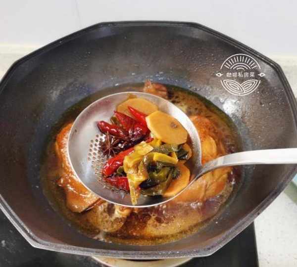 第7步、將醃制雞腿的料水除去大蔥倒入鍋中,加入沒過雞腿的開水,放入幹辣椒、小蔥結和八角,大火煮5分鐘,轉小火加蓋燜制20分鐘。