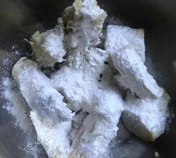 第2步、紅薯晾涼後去皮放入適量面粉,不易太多哦。