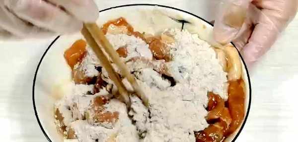 3.把蒸肉粉和肉一起攪拌均勻,一次半包就足夠瞭。