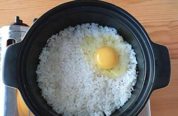 然後放入泡好水的大米,開中火,煎幹底部後加水末過大米,轉開中小火煮。煮至水看不見,大米有六七分熟時,將牛肉鋪平,中間打入一顆雞蛋,繼續蓋上鍋蓋煮。