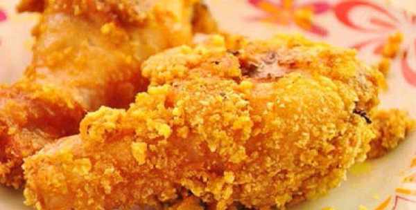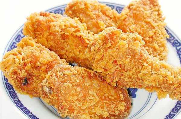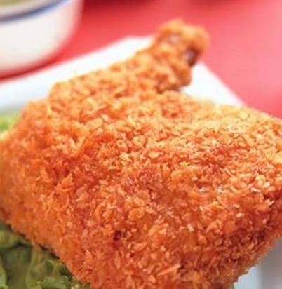 第三步、油鍋加熱放入食用油,油溫達到六成熱的時候,將雞腿放在裝有面糊的容器裡裹上一層面糊,然後提起,是表面多餘的面糊流下,然後用面包糠均勻地撒在表面,放入油鍋中炸制。