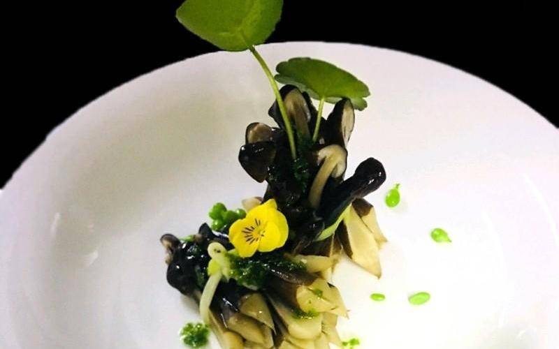 最後擠上韭黃葉,淋入蔥油,用三色堇點綴即可。